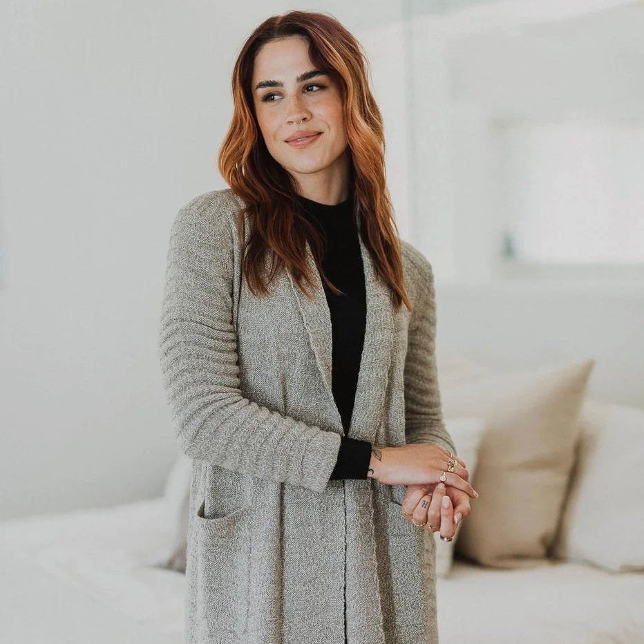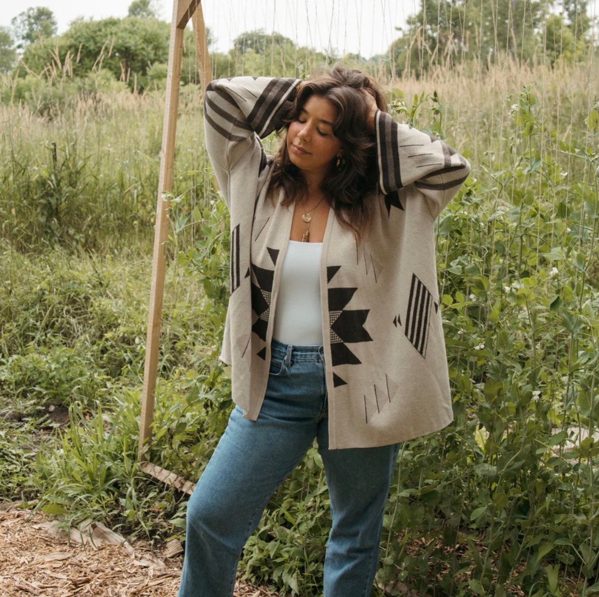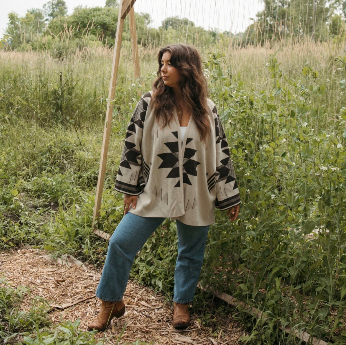 This is an elevated basic, an authentic little luxury and will last for years to come in any capsule wardrobe. The Jacqueline Jacquard Sweater is a classic one-size-fits-most open cardigan that comes to the hip and has a bell sleeve. Made with a Peruvian alpaca which is warmer than wool, and less itchy.