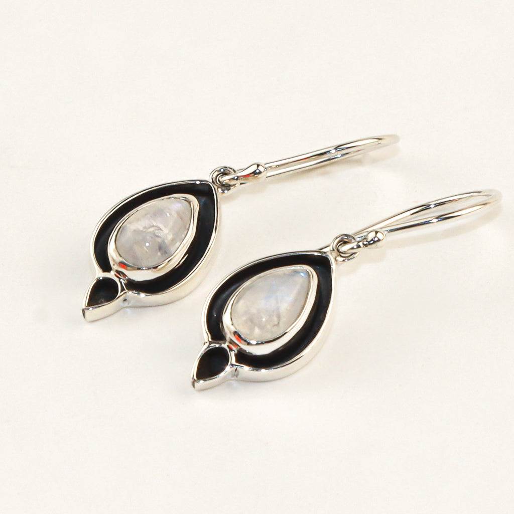 These moonstone earrings were hand crafted in Bali by local artisans and set in sterling silver. Capturing the ethereal glow of the moon, moonstone is a symbol of intuition and femininity. Let its luminosity enhance your inner strength. Moonstone, a feldspar mineral mined in Sri Lanka, India, and Madagascar, reflects the magical play of light reminiscent of moonbeams.