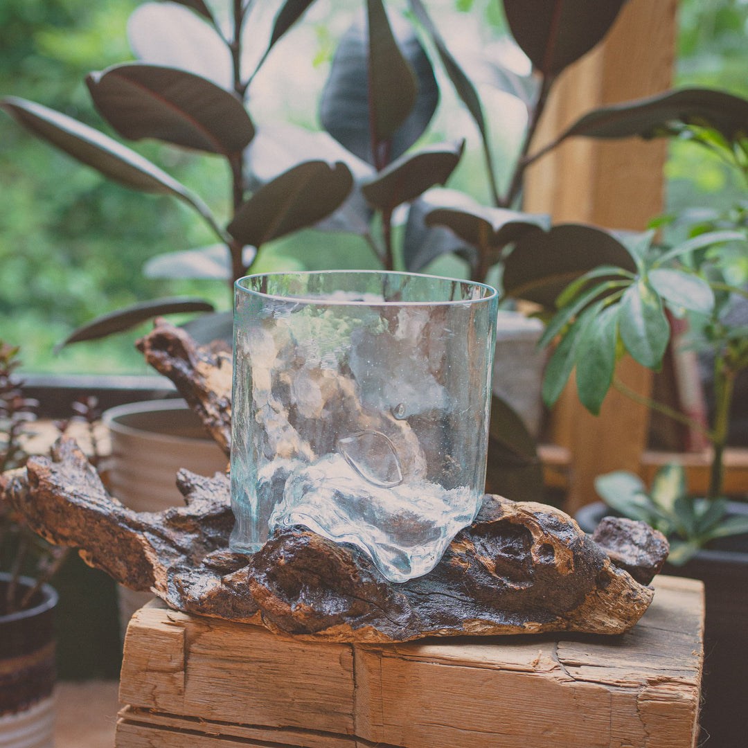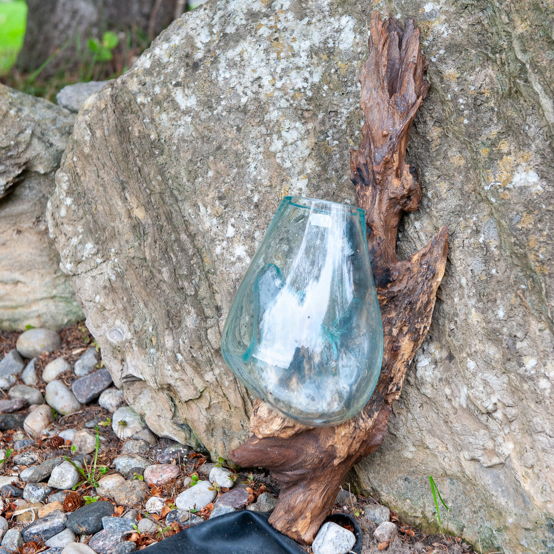 Discover the beauty of our handcrafted glass globes on gamal wood, meticulously crafted by local artisans in Bali. Each piece is made from recycled glass and sustainable gamal wood, creating a stunning fusion of natural materials. The glass globe is mouth-blown and cooled onto the base, slightly charring the wood and ensuring a perfect fit.