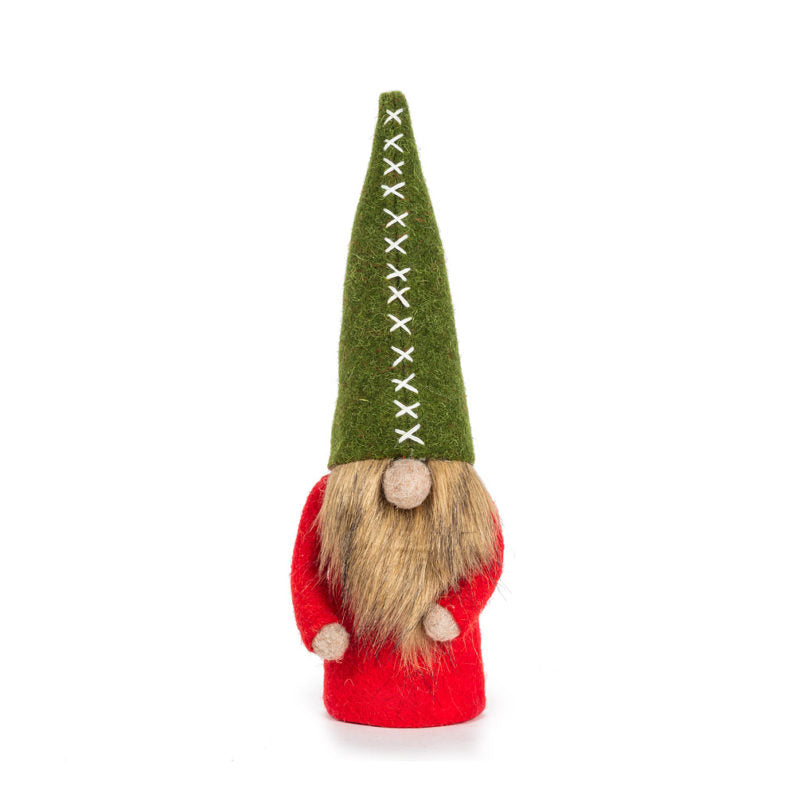 This bearded gnome features an extra tall tan hat with cross stitch detailing, making a cute and playful addition to your holiday decor.