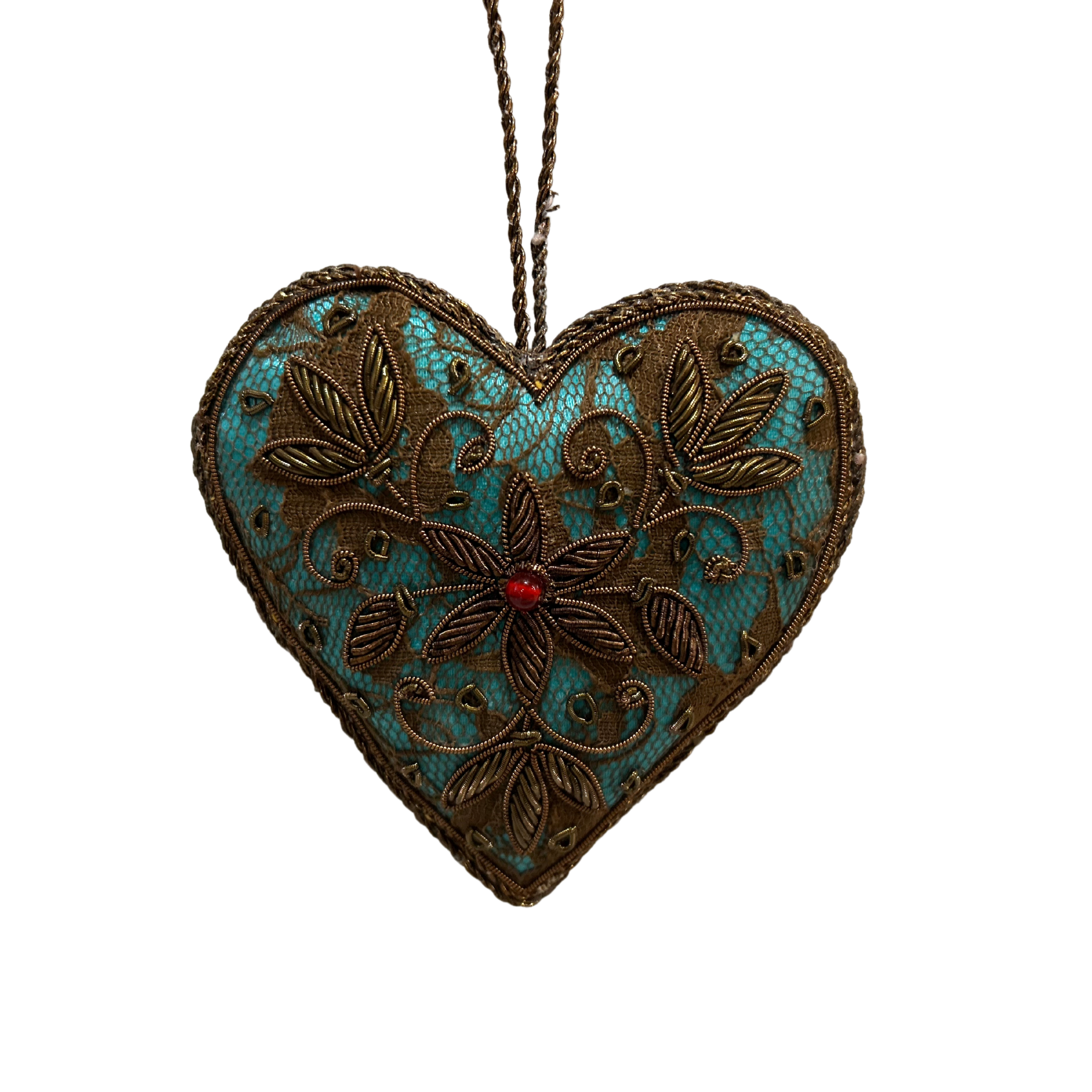 This heart ornament was handcrafted in India with zari embroidery and will make a beautiful, festive addition to any Christmas tree.
