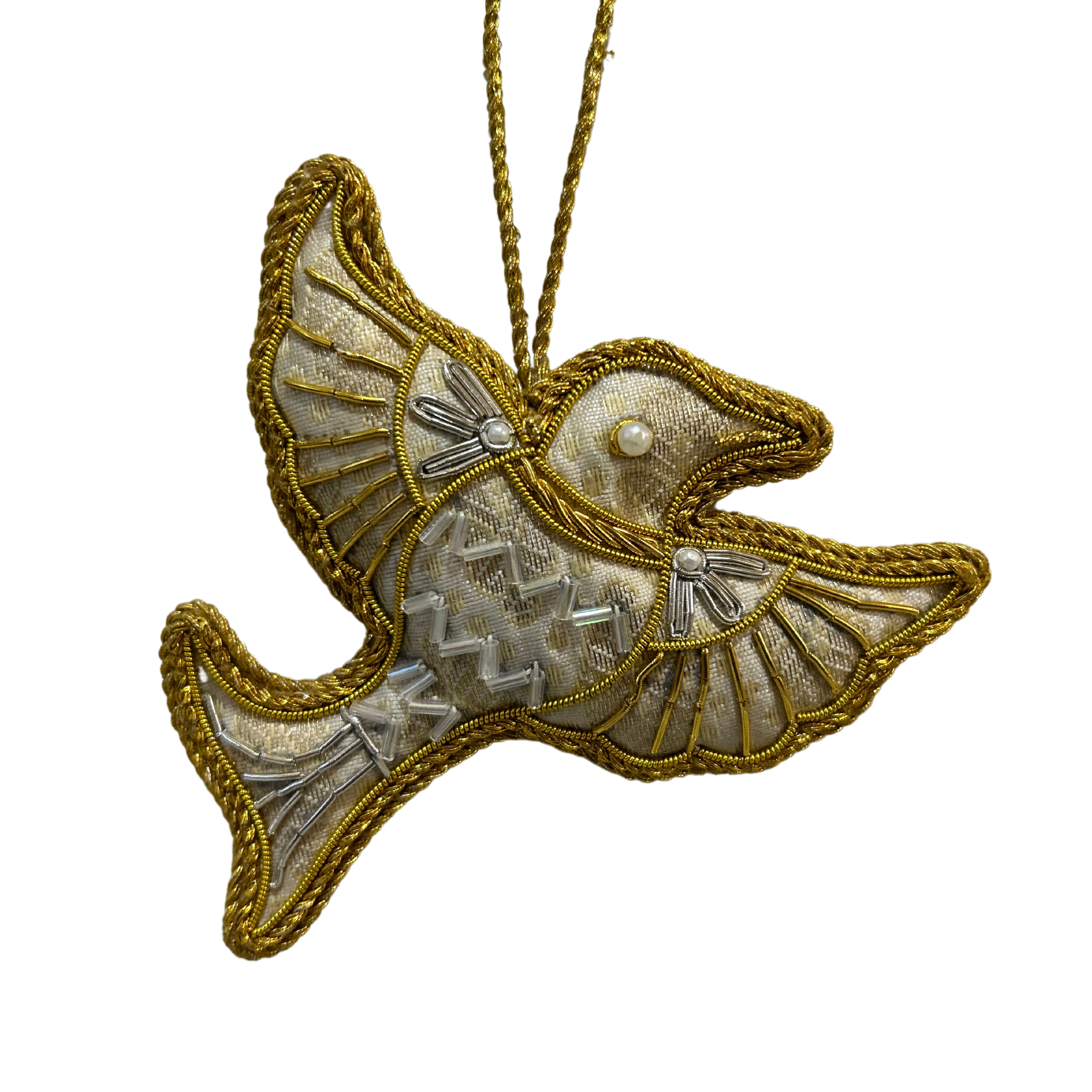 This tree ornament was handcrafted in India with zari embroidery and will make a beautiful, festive addition to any Christmas tree.