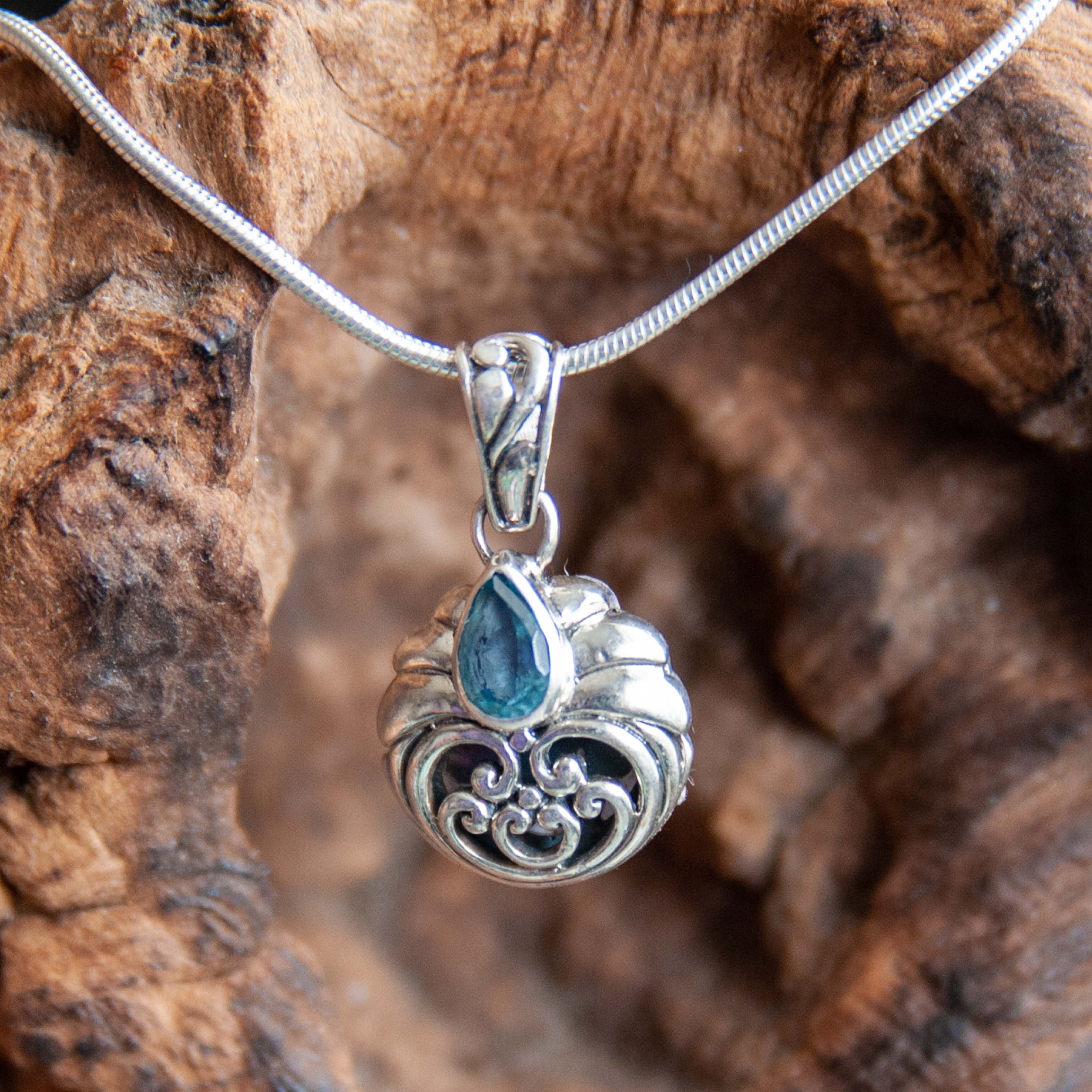 The gorgeous colours of this blue topaz pendant set in sterling silver are handcrafted in Bali are sure to make a statement. Blue topaz is the December birthstone and symbolizes honesty, deep emotional attachment, and clarity of feelings