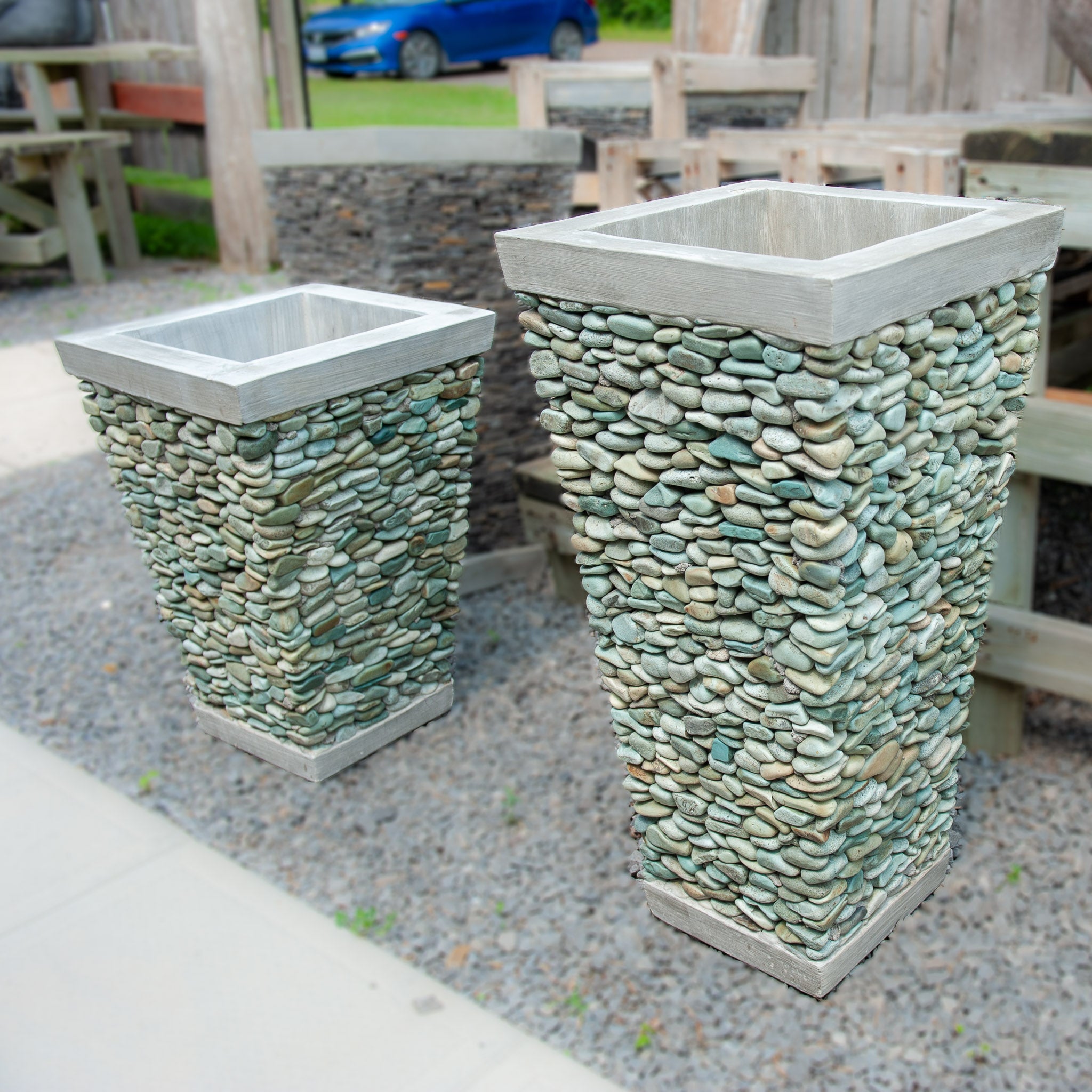 This cement planter wrapped in stone fits in with just about any home style modern to minimalist, rustic too contemporary. These are handcrafted in Indonesia. Perfect for the garden, porch or in the home for anytime of year.