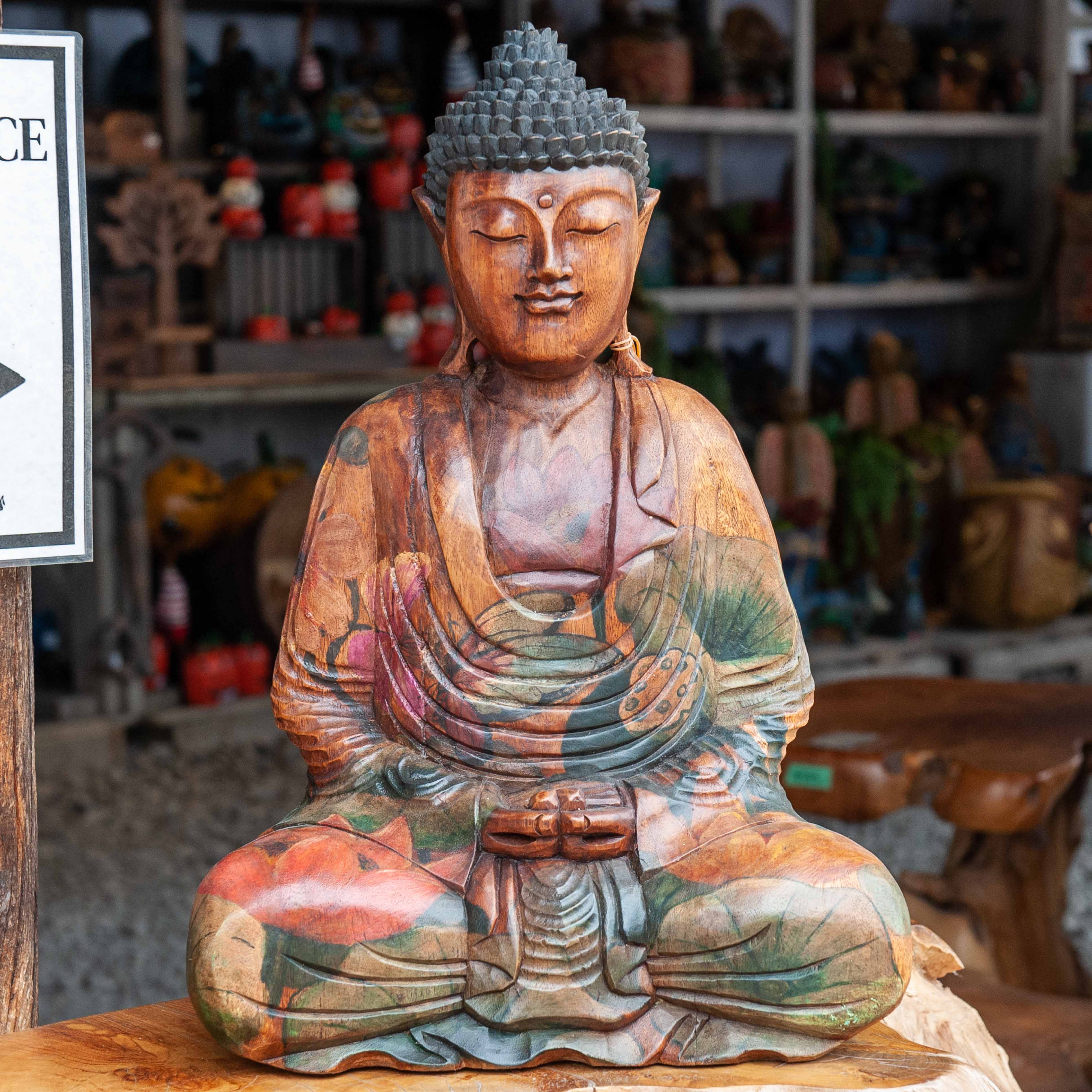 Sculpté à la main par des artisans locaux à Bali, ce bouddha priant est fabriqué à partir de bois de suar. Symbole de sagesse et d'illumination, ce bouddha est finement sculpté pour apporter tranquillité et sérénité à n'importe quelle atmosphère. Une finition florale peinte à la main crée un design époustouflant et une merveilleuse pièce de conversation.