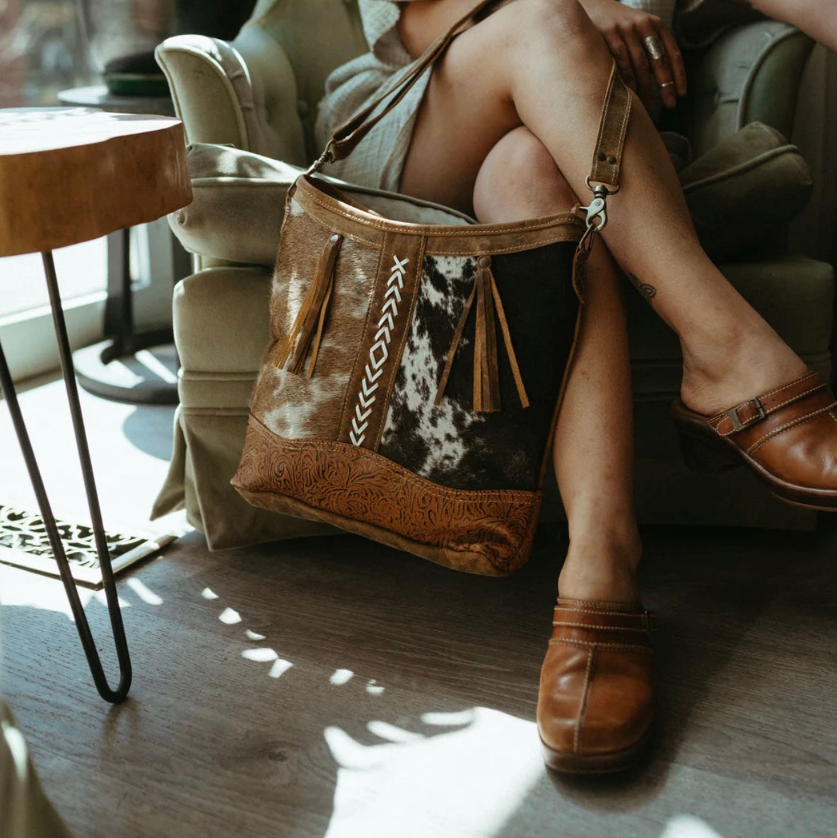 Bag made up of cotton rug, canvas and buff leather & hairon with brass hardware accessories |