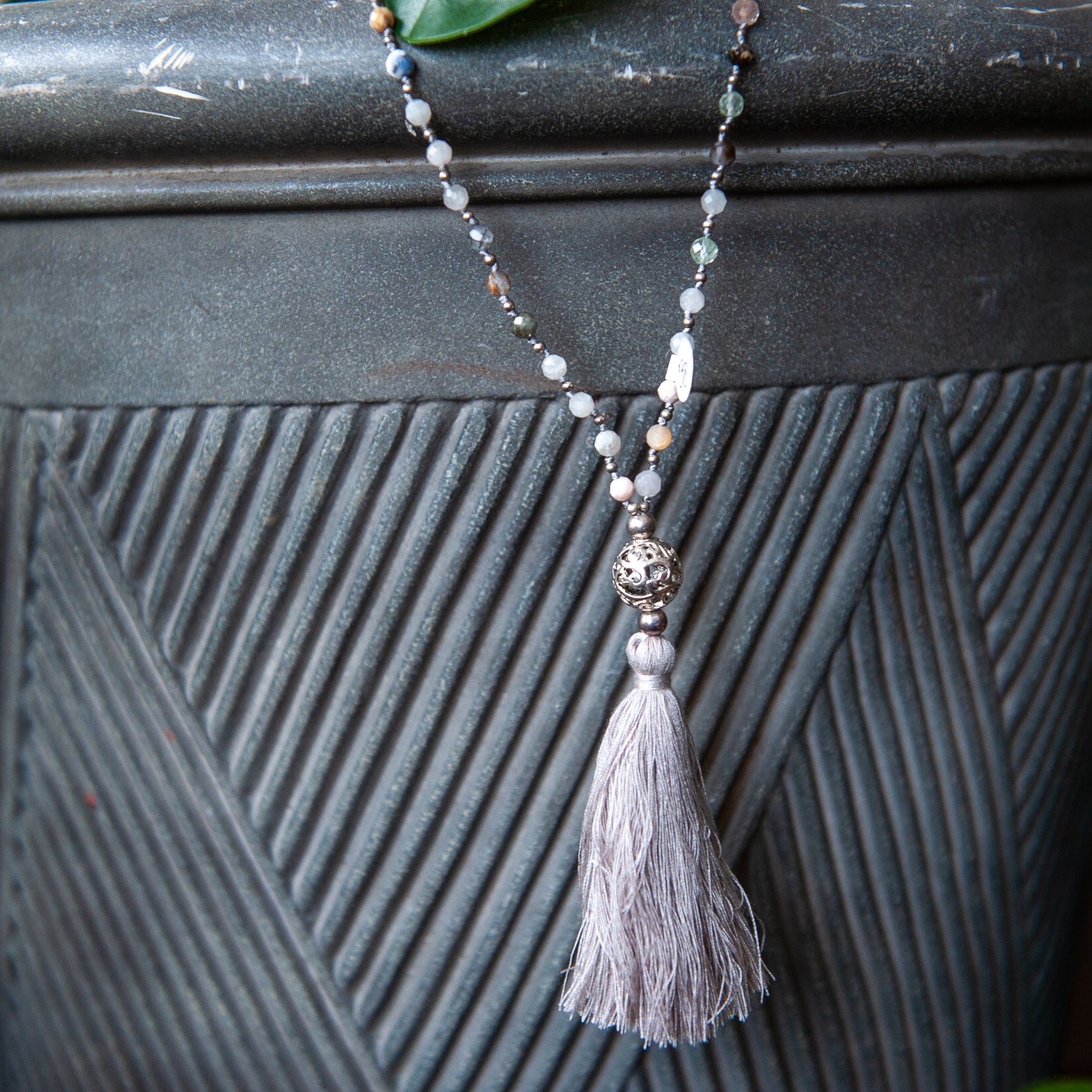 Wear this necklace on your daily ventures, or as focus beads, helping you meditate and stay grounded. The special properties of the chosen stones are what make the necklace all that it is… Since special gemstones and beads have spiritual and healing properties, wearing this mala necklace with silver ornament and tassel might just be what you need to have a better and happier day.