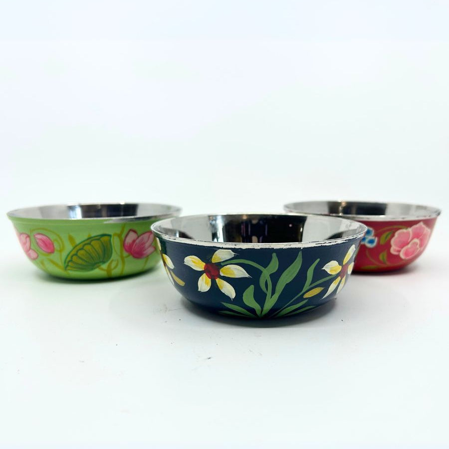 These stainless steel bowls from India are hand painted in the traditional Rajasthani style. Perfect for both decorative display and practical use, these bowls blend functionality with artistic elegance, making them ideal for enhancing any dining or living space.
