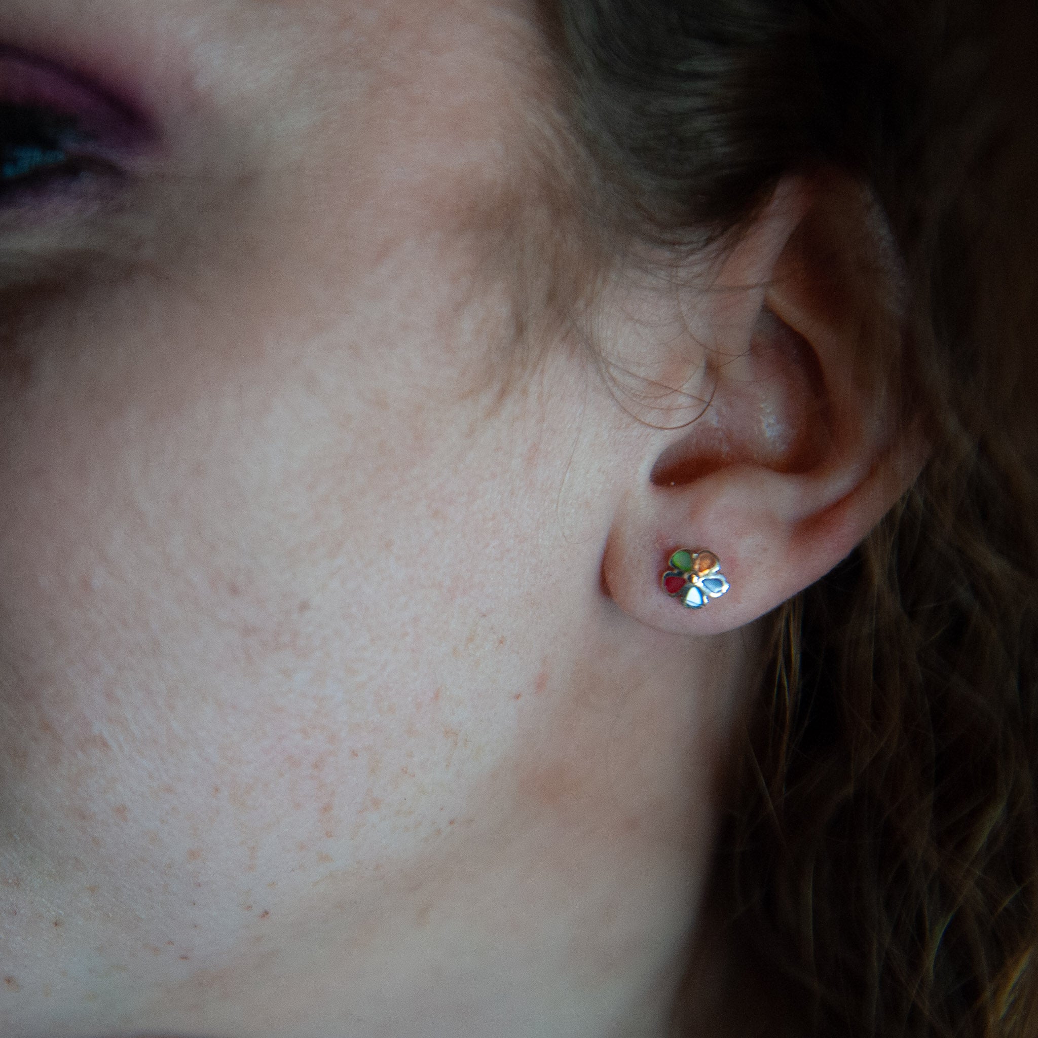 Handcrafted by local artisans in Thailand, this rainbow inlaid, silver, half-crown shape earrings makes a statement while being versatile enough to mix and match with other jewellery pieces.