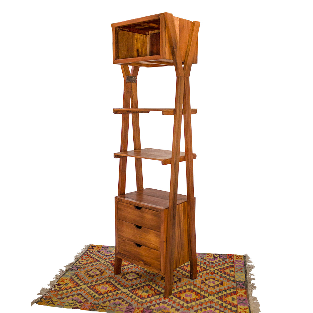 Parfait à côté de votre téléviseur pour ranger tous vos appareils électroniques, livres, disques ou autres ! Cette étagère en bois de teck fabriquée à la main est fabriquée par Junthima Uiprasert de Chiang Mai, dans le nord de la Thaïlande, est réalisée dans les moindres détails pour être vraiment une pièce remarquable dans n'importe quelle maison.